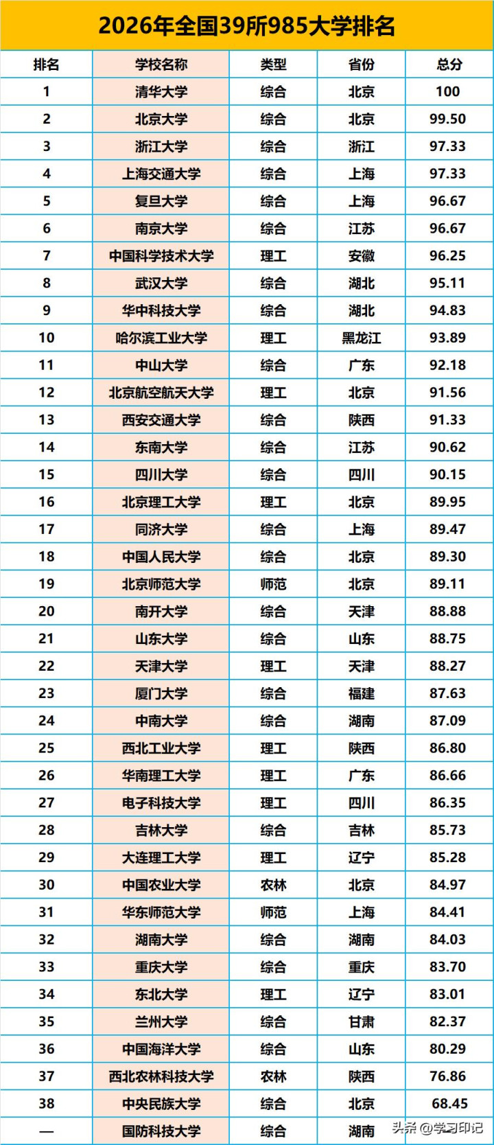 39所985大学最新排名